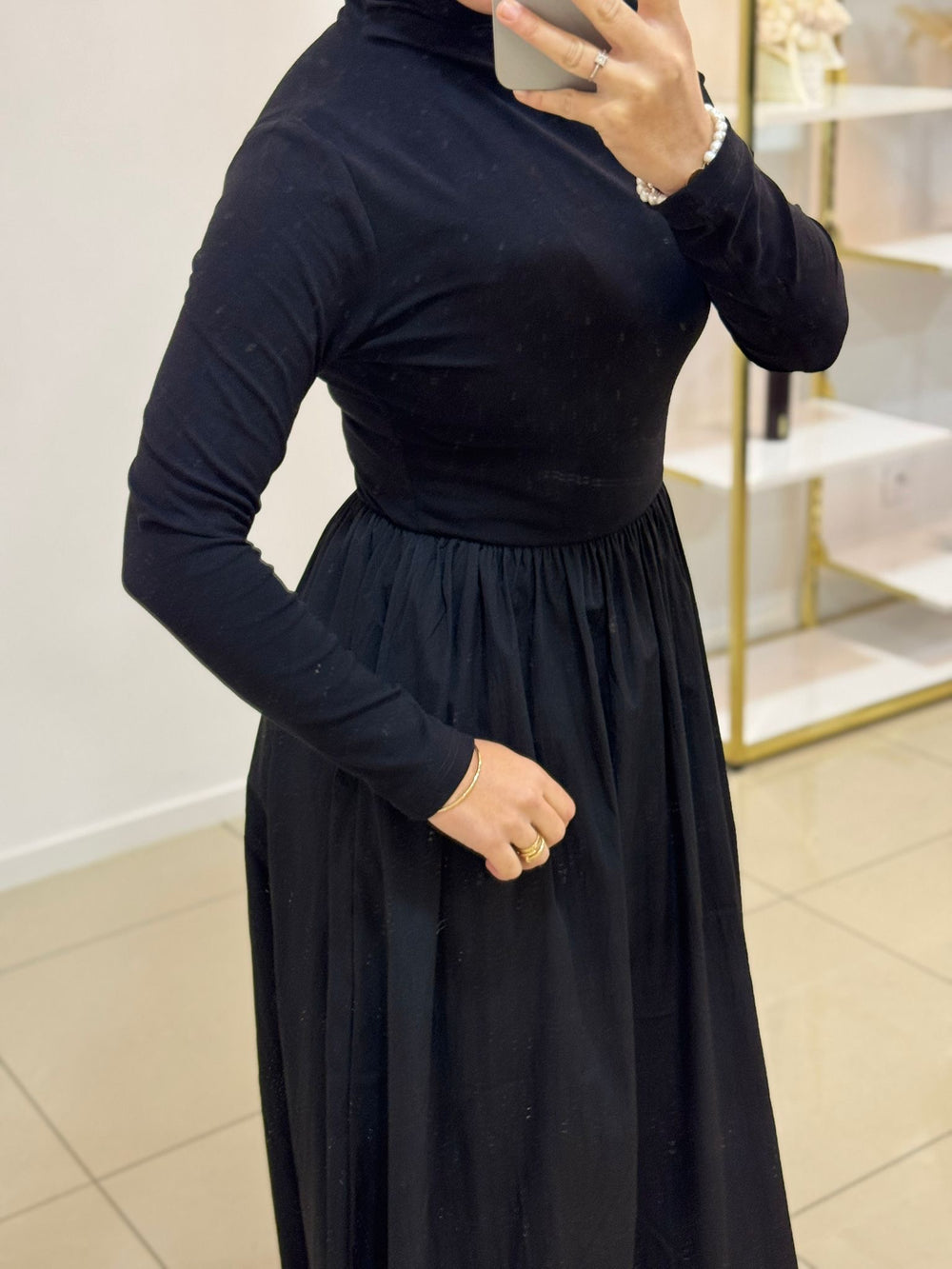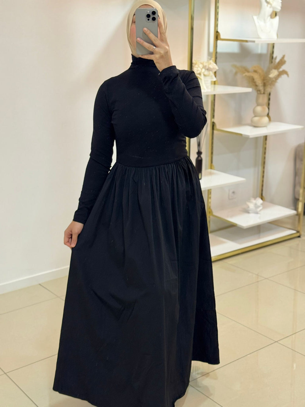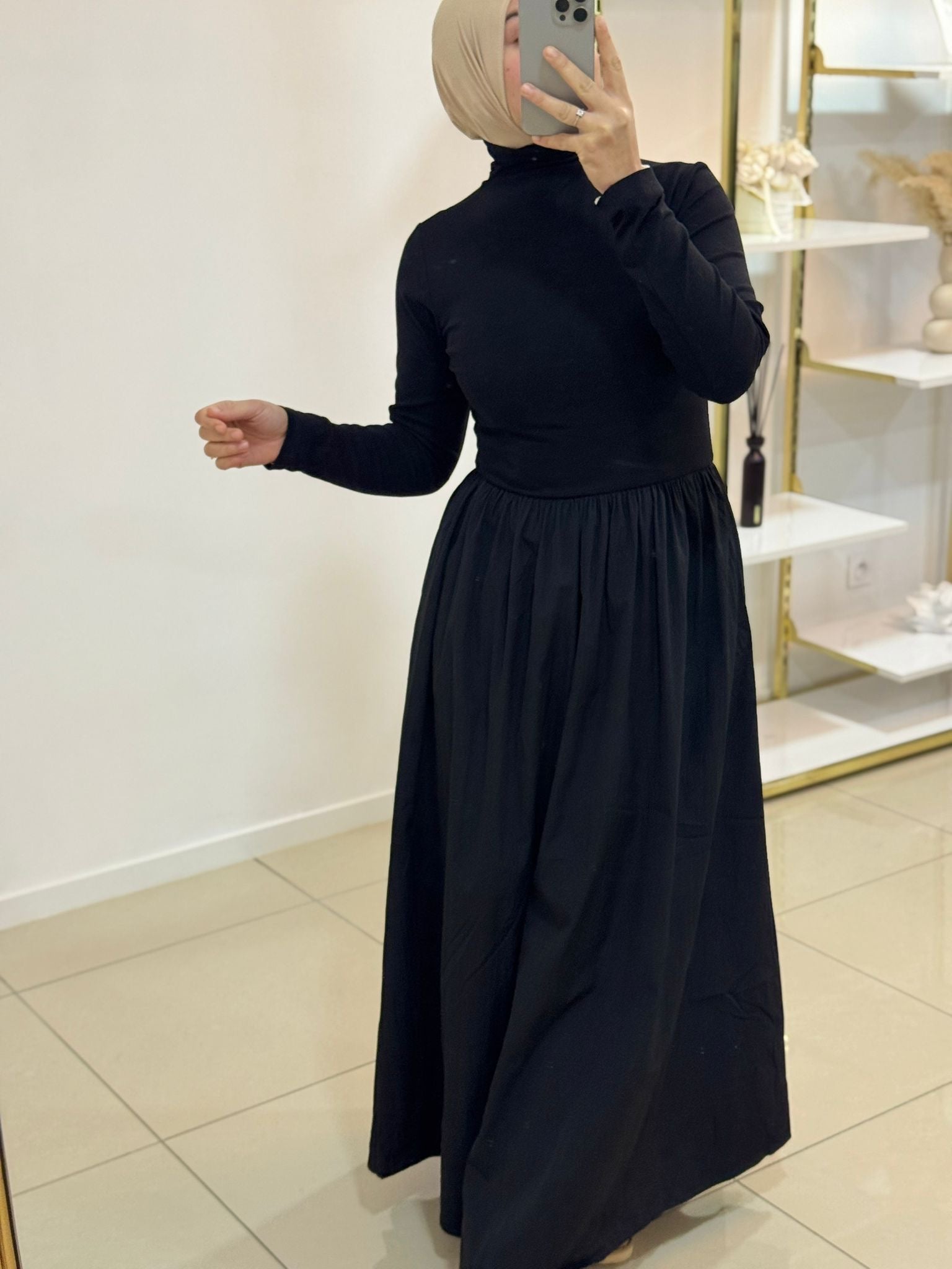 Robe élégante au design raffiné, mêlant deux matières pour un rendu chic et moderne. Sa coupe soignée met en valeur la silhouette tout en offrant un confort optimal, idéale pour les occasions comme pour le quotidien.