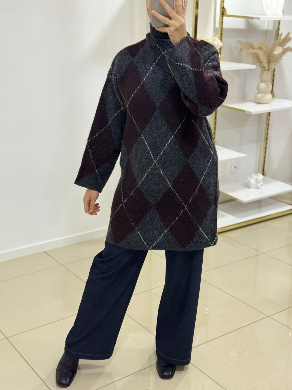 Pull marron et gris à motifs losanges, à la fois élégant et confortable. Une pièce facile à porter pour un style tendance au quotidien.